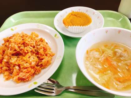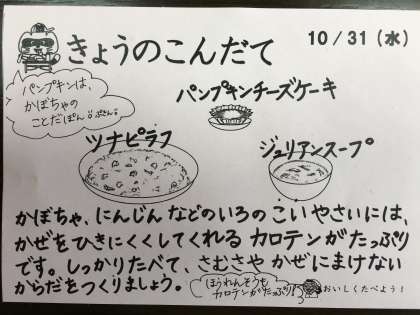 今日はハロウィンですね。パンプキンチーズケーキ、凄く美味しいです。給食でこんな美味しいデザートが出るなんて、びっくりです。