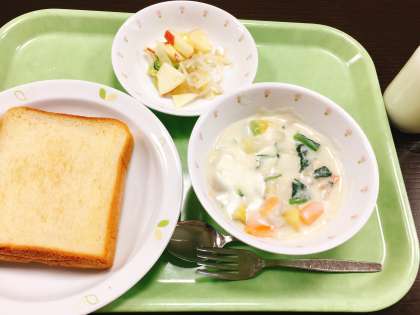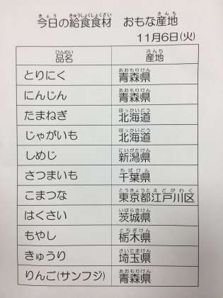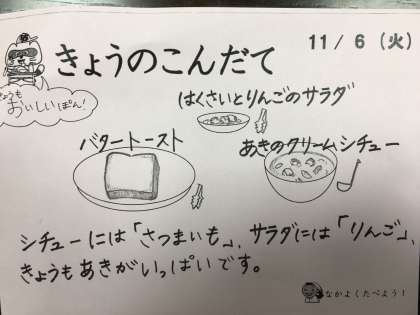 今日も秋の味覚がいっぱいの給食です。新潟県のしめじに北海道のじゃがいも、千葉県のさつまいも、青森県のサンフジ。秋のものは美味しくて、秋なのに飽きないです。あっ、気にしないでください。諦めないで、続けますから。