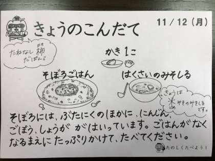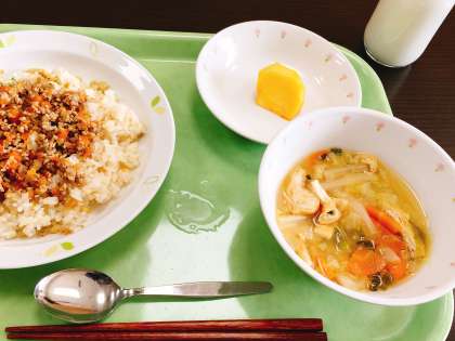 今日は、そぼろごはんです。そぼろだけでなく、ごはんにも味付けがしてあって、とても美味しいです。