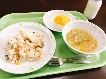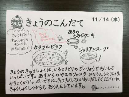 今日はカラフルピラフ、昨年までのセンター給食の「三色ピラフ」と同じ感じです。明らかに3色以上ですけど。スープは、私の大好きなジュリアンスープ、思わず「ジュリアーン」と、叫んでしまいました。心の中でですけど。