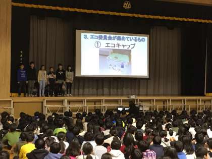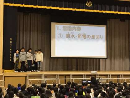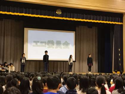 6年生のあいさつの号令に続いて、今日は委員会発表集会です。エコ委員会と国際理解委員会の発表がありました。エコ委員会からは日頃取り組んでいる活動紹介がありました。