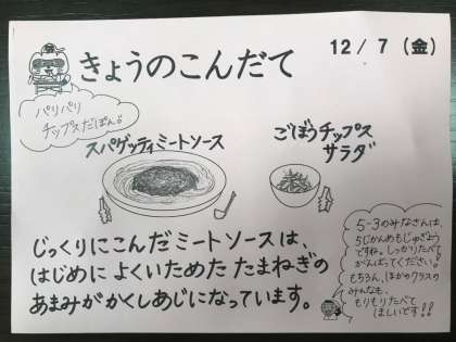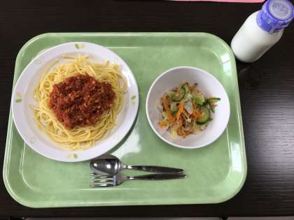 今日の献立はスパゲティミートソース、ごぼうチップスサラダ、牛乳です。ごぼうチップスはパリパリしていておいしいです。余談です。久しぶりに今日の午前中、5年生と算数の問題に格闘しました。その場では答えが出せず、職員室に戻って改めて考えてみたら、解けました。スッキリした気分になりました。じっくり考えることは大切ですね。