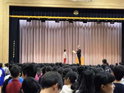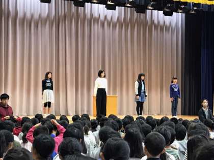 6年生のあいさつの号令に続いて、校長先生からは風邪をひかないように生活の工夫をしようというお話がありました。剣道で優秀な成績をおさめた児童の表彰がありました。