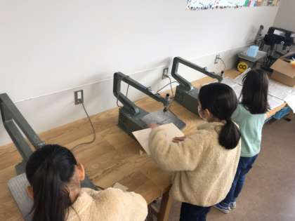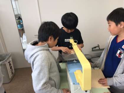 つくってつかって楽しんで。電のこを使って、板を切り取り、クリスマスツリーを作っています。