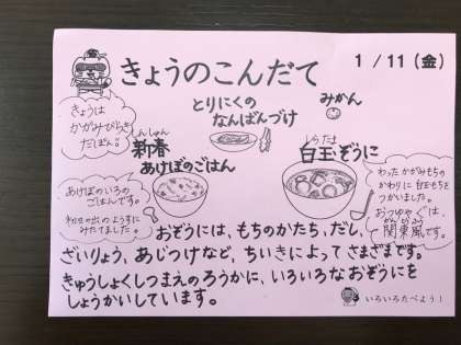 今日は鏡開きです。お餅のかわりに白玉が入ったお雑煮です。おつゆも具も、関東風です。栄養士のYさんも調理チーフのKさんも、これを書いている私も、家で食べるお雑煮は関東風で他のタイプを知りません。皆さんはどんなお雑煮を食べましたか。お餅は切り餅か丸餅か。だしはすまし仕立てが全国の約7割なんだとか。今度教えていただければ幸いです。
