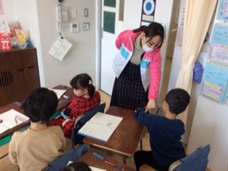 算数では、長さの学習をしています。筆箱や消しゴムなどの身近な物を使って、机の長さをはかっています。