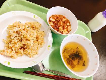 今日はチャーハン、麻婆豆腐、ねぎとわかめのスープです。中華の3点セットとは豪華ですね。