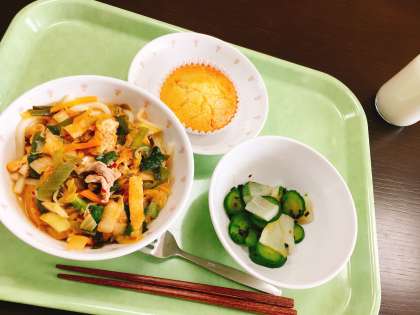 今日はキムチうどんです。キムチって便利な食材ですね。そのまま食べてもよし、鍋やうどん、チャーハンに入れても美味しいです。