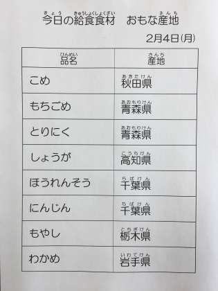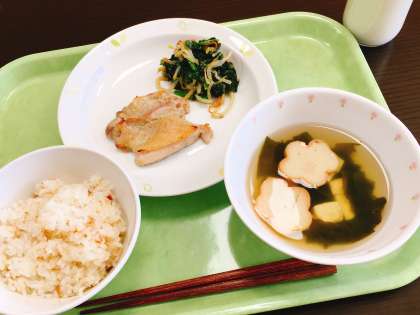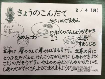 今日は立春献立で、梅おこわ、鶏肉の山椒みそ焼き、野菜のごまあえ、立春すまし汁です。