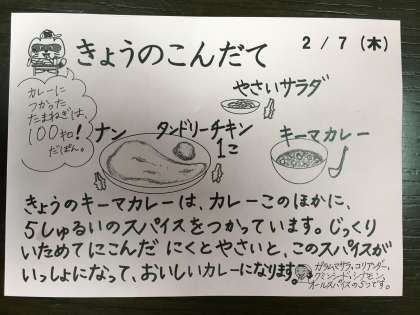 今日はキーマカレーです。今月はカレーが食べられて嬉しいです。