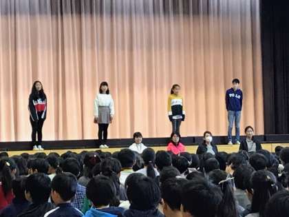 久しぶりの全校朝会です。6年生のあいさつの号令に続いて、校長先生からは、インフルエンザに気をつけて過ごそうというお話がありました。区の図工展に出品した子どもたちの表彰がありました。