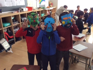 かぶって へんしん。色とりどりのお面が出来上がりました。