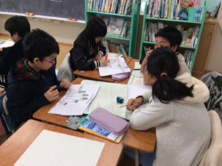 社会科の授業です。発表に向けて、グループで発表原稿などを練っています。