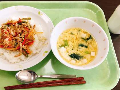 今日は青椒肉絲丼と、豆腐と玉子のスープです。