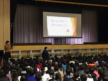 応援団長の6年生の気合の入ったあいさつの号令に続いて、今日は食育朝会です。1年間の食生活を振り返るお話でした。