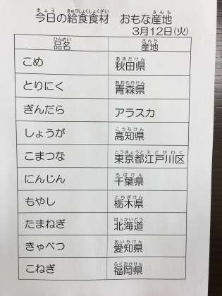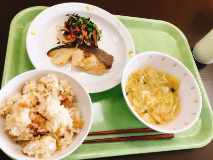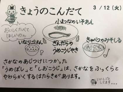 今日は、いなりごはん、銀鱈の梅麹やき、小松菜の磯あえ、きゃべつのみそ汁です。