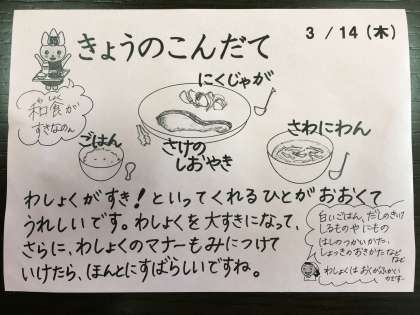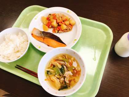 今日は、鮭の塩焼き、肉じゃが、沢煮わんです。