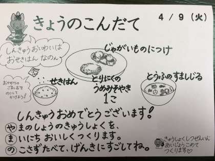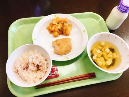 今日から新年度の給食が始まりました。進級お祝いということで、赤飯です。じゃがいもの煮付け、鶏肉の梅みそ焼き、豆腐のすまし汁と一緒にいただきます。大きめの鶏肉がちょっと箸では取りにくい(鶏肉食い?)のですが、梅の香りが食欲をそそります。