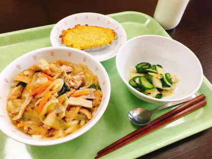 今日は、きつねうどん、野菜の浅漬け、スイートポテト、牛乳です。