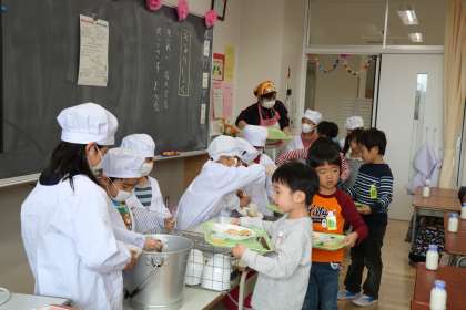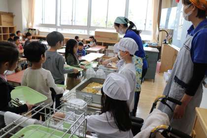 給食当番さん、緊張しながらも上手にできました。お仕事が終わってホッとしている表情です。