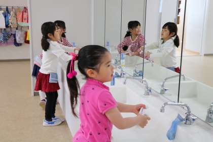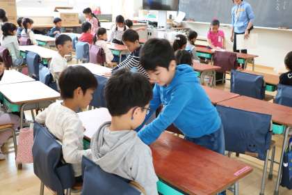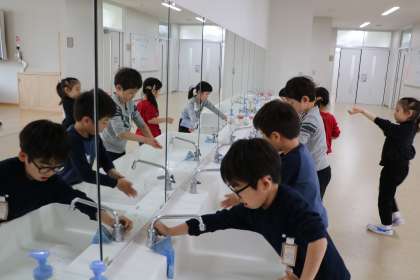 今日は1年生の初めての給食です。1年生入学お祝いメニューのちらし寿司です。1年生は、楽しみ半分、ドキドキ半分なことでしょう。でも、担任の先生と一つ一つ確認しながら全員で給食のやり方を勉強します。手を洗い、机をふくところから始まります。給食当番ではなく待っている友達も、おしゃべりせず静かに待ちます。みんなで協力、真剣です。