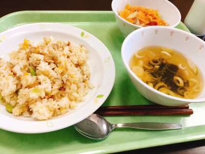 今日はチャーハンです。今日のチャーハンは、枝豆入りです。緑が鮮やかで彩りがあり(写真ではあまり早分からないですね)、とても美味しいです。かつおダシのスープも美味しいです。