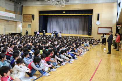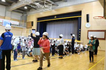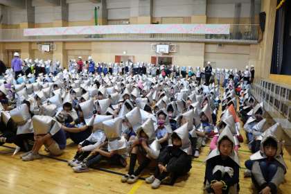 副校長先生の「山野の避難訓練は、おしゃべりが一切聞こえません。一年生もしっかり見てください。」の通り、真剣に取り組む2〜6年生でした。