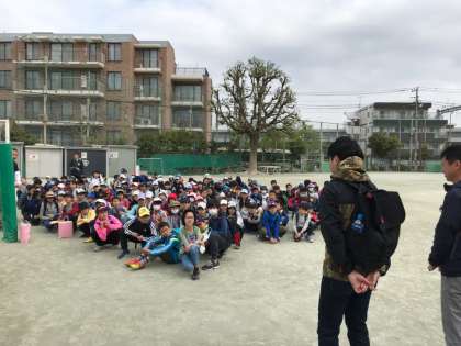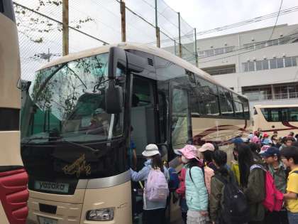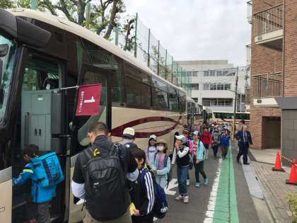 薄曇りの遠足日和。5年生はバスで高尾山に出発です。
