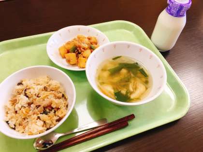 今日は、山菜おこわ、じゃがいものそぼろ煮、水菜のすまし汁、牛乳です。