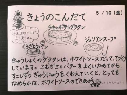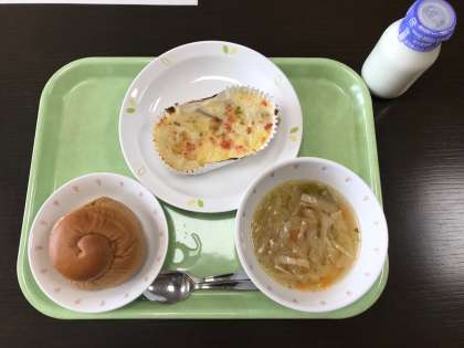 今日はパンが主食です。黒砂糖パンです。チキンポテトグラタンはホワイトソースから手作りです。おいしくいただきました。私が小学生の頃の給食はパンが主食で、たまにソフト麺が登場していました。パンは食パンばかりで、マーガリンかジャムをつけるパターンでした。随分、献立も様変わりしたなと改めて思います。未来の学校給食は、どんな風になっていくのでしょうか?