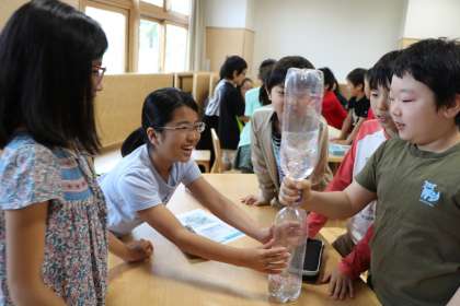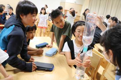 写真は、TOTO株式会社の方にご協力いただき、5年生「みんなに優しいパブリックトイレを考えよう」の授業の様子です。以前は18リットルの水が1回に流れていましたが、渦巻きのように流す仕組みを開発してからは5リットル弱の水量だとか。節水が可視化できる実験道具で、確認している様子です。