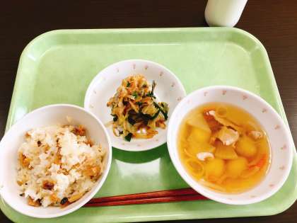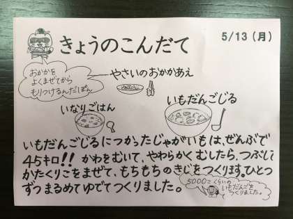 今日は、いなりごはん、いもだんご汁、野菜のおかかあえ、牛乳です。いなりごはんは、酢飯なので食が進みます。いもだんごのもちもち感は、片栗粉をまぶしてあるからなのですね。45キロのじゃがいもで、5,000個も作ったそうです。手間ひまかけて作っているので、とても美味しいです。