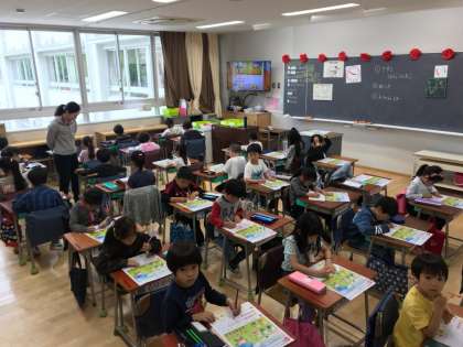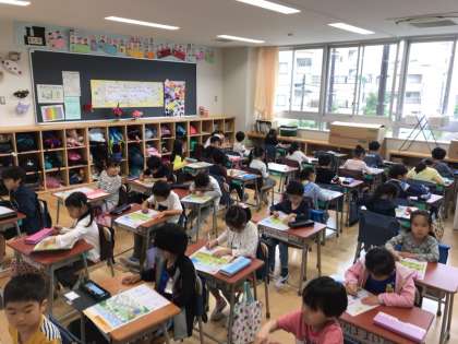あいにくの雨で、遠足は延期になりました。小学校生活初めての算数テストに取り組みました。机を横向きにすること、自分の頭で考えて解くこと、名前をしっかりと書くことなど、一つ一つを丁寧に確認してから始めました。
