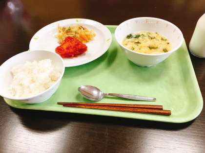 今日は、鶏肉のチリソース、春雨の中華炒め、豆腐と玉子のスープ、牛乳です。