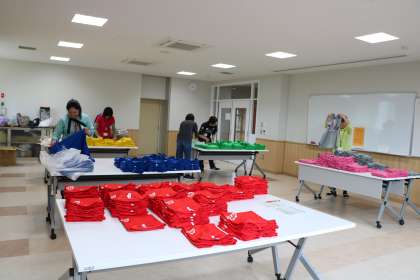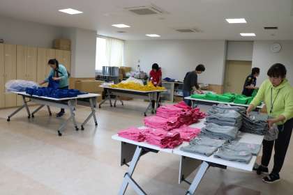 申し込みをされた方のTシャツが届き、色別に納品確認をしているところです。色がきれいですね。