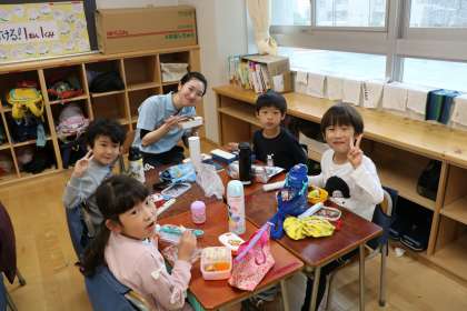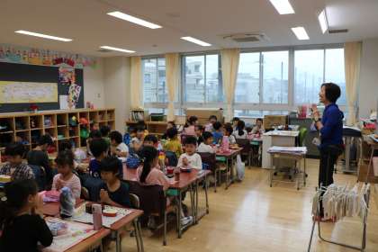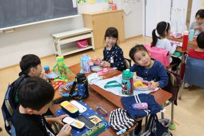 1年生の遠足は、今日もあいにくの雨で行かれません。これだけ朝から本降りの雨なので、1年生の子どもたちも「いかれないよね」「しかたないね。雷もなるかもしれないんだって」と、朝から天気と遠足の話が聞こえてきます。写真はお弁当タイムの様子です。先生も一緒に「いただきます!」
