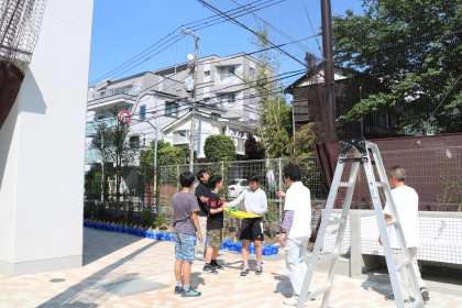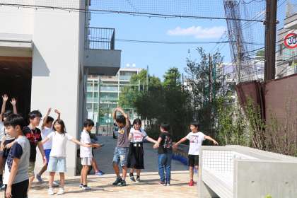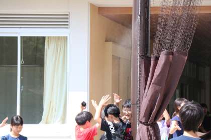 熱中症対策の一つとして、ミストシャワーを設置しました。大喜びの子どもたちです。