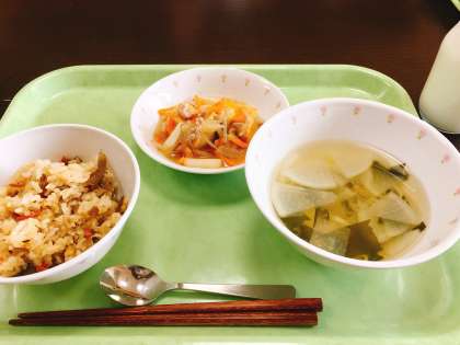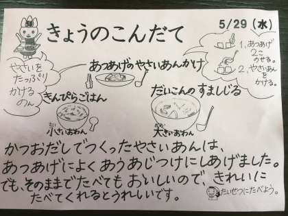 今日は、きんぴらごはん、厚揚げの野菜あんかけ、大根のすまし汁、牛乳です。