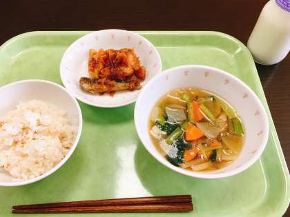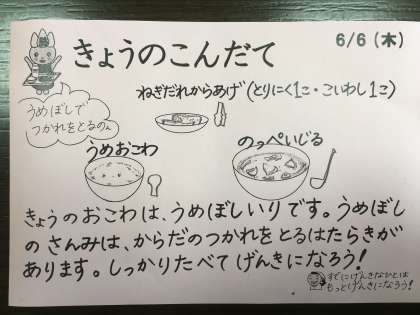 今日も和食、梅おこわ、ねぎだれから揚げ、のっぺい汁、牛乳です。梅おこわは、梅干しを入れて炊き込んだおこわで、酸味ともちもちした食感が、食欲をそそります。ねぎだれ唐揚げ、タレがとても美味しいですね。これ、考えたのダレ?