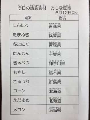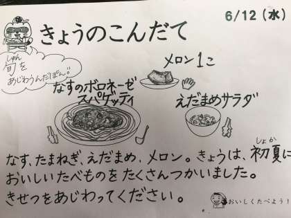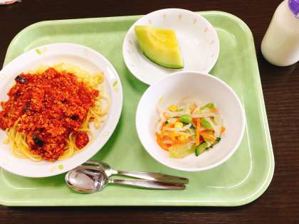 今日は、なすのボロネーゼスパゲティ、枝豆サラダ、メロン、牛乳です。