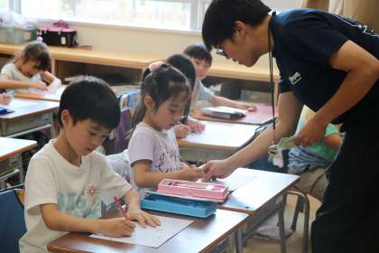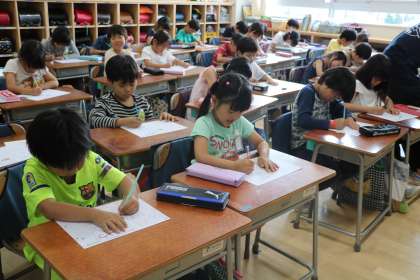 ひらがなの学習、今日は「や」です。正しくしかり書けたところに、青シールをはってもらいます。「きれいに書けたね。宿題で練習するときはこの字と同じくらいきれいに書いてこようね。」と声をかけてもらっています。子どもたちは、どの子も嬉しそうです。そして、「校長先生見て。青シールの字よりもっときれいにかけたよ。」と私にも見せてくれます。子どもたちのさらに頑張ろうとする力は素晴らしいです。