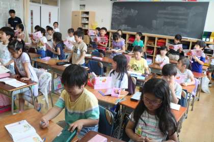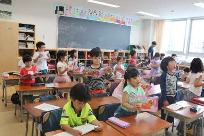 1年2組の国語の授業の様子です。詩の本を手に、声を合わせて音読します。竹の子読みや役割読みなど、子どもたちがきちんとルールを守って、いろいろな読み方で楽しんでいます。黒板には、45分の授業の見通しが貼ってあるので、安心して学習に取り組めます。
