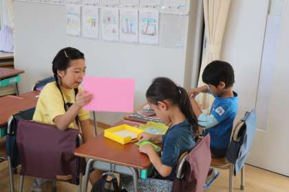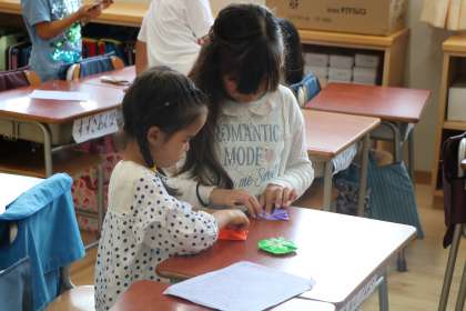 室内で遊んでいる子もいます。1年生の様子ですが、6年生が毎朝何人か来てくれるので、一緒に絵をかいたり、折り紙をしたり、心がほっこりする姿がたくさん見られます。