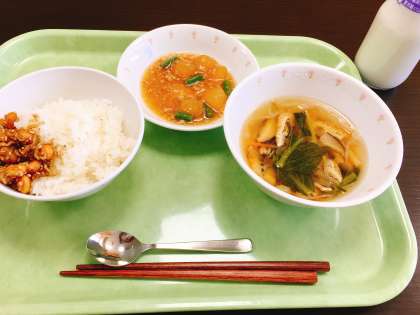 今日は、大豆とじゃこの甘辛揚げ、冬瓜のそぼろ煮、沢煮わん、牛乳です。