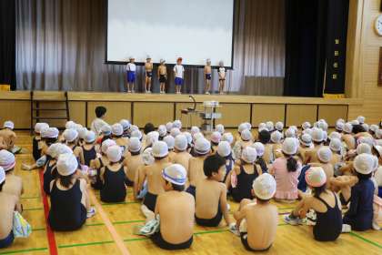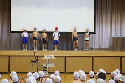 今日は、水温気温が低かったため、水泳学習は中止でしたが、1・2年生とも、体育館でプール開きを行いました。1年生は着替えの練習やバディーの練習もしました。1年生クラス代表のプール開きの言葉は大変立派でした。