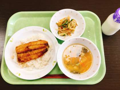 今日は、鰯の蒲焼丼、野菜のおかかあえ、油揚げのみそ汁、牛乳です。