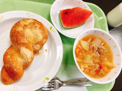 今日は、きなこ揚げパン、トマトポトフ、小玉スイカ、牛乳です。