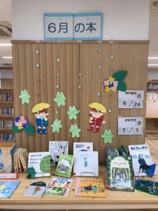 今日はあいにくの雨です。図書室の中には、雨などに関連した本が集められています。