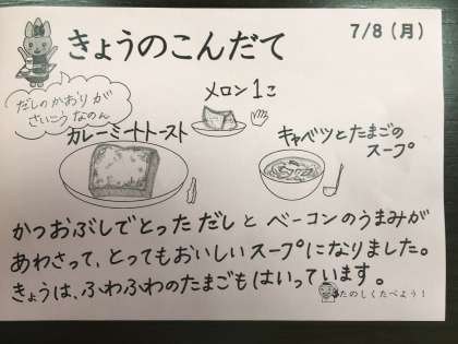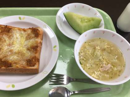 今日は、カレーミートトースト、キャベツとたまごのスープ、メロン、牛乳です。