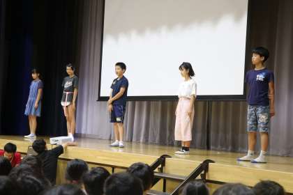 今日は、委員会紹介集会でした。初めに6年生のあいさつです。学校中に響き渡る声であいさつをしましょうの声に、全員の元気のよい挨拶で1週間がスタートしました。